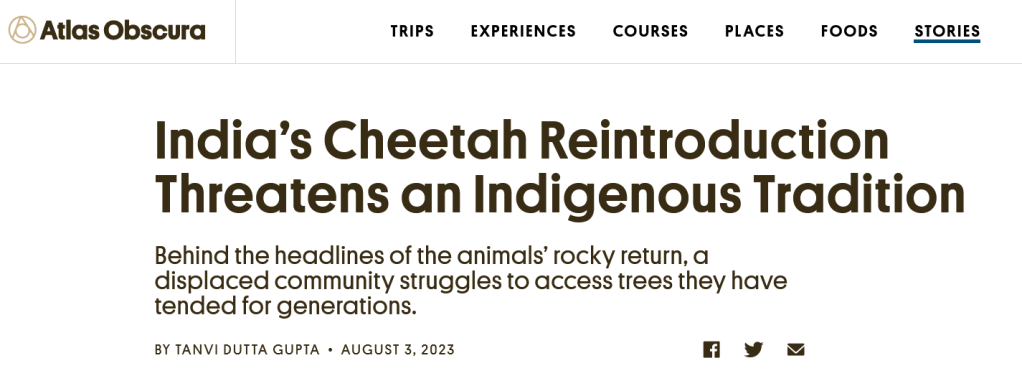 Here’s an interesting article by Tanvi Dutta Gupta that explores the human cost of re-wilding and reintroduction projects, and also traces my personal journey in the Kuno forests. We have much to learn about the ways of the forest from the local communities that inhabit their vicinity.